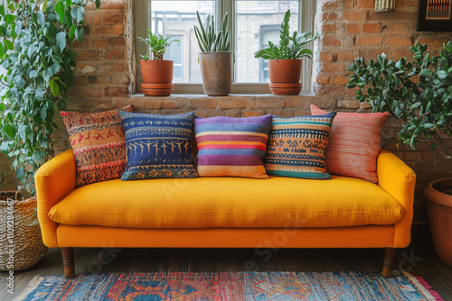 Eclectic living room with vibrant colors and textured cushions inviting relaxation and comfort