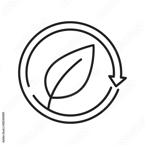 Eco friendly icon with a leaf inside a circular arrow representing sustainability renewable resource and environmental conservation concept line vector stroke