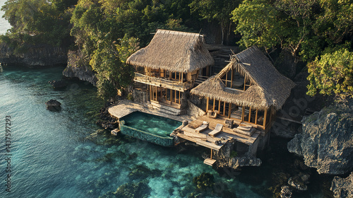 Eco villa with bamboo detailing and thatched roof by serene ocean