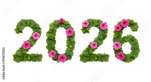 Eco-friendly 2026 numbers made of green leaves and pink flowers, symbolizing nature and sustainability, perfect for environmental projects