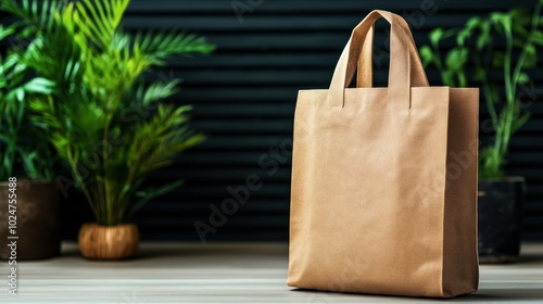 Eco-friendly brown reusable shopping bag with handles on wooden surface, surrounded by green potted plants and black background.
