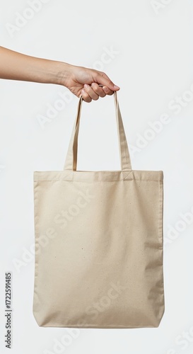 Eco-Friendly Handbag: An isolated hand gracefully holds an eco-friendly, neutral-colored shopping bag, symbolizing sustainable practices.