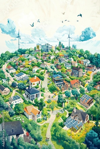 Eco-friendly hillside village, solar homes, wind turbines.