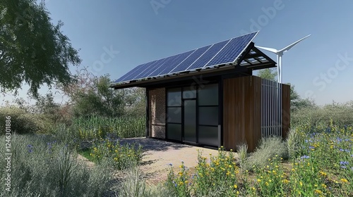 Eco-Friendly Prefab Home with Solar Panels and Wind Turbine in Nature