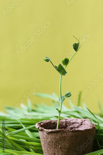 Eco-friendly spring garden vertical background of olive green. A young pea sprout growing in a peat pot on fresh grass.