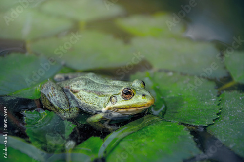 Ecological crisis. Swampy river and a frog