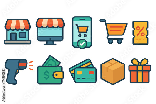 E-commerce, shopping flat icon set. retail, online store icons flat collection