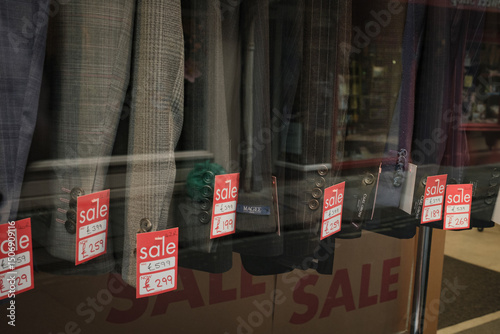 Economy business concept. Suits and jackets reduced in price in a shop window. Red sale tags. Britain, UK.