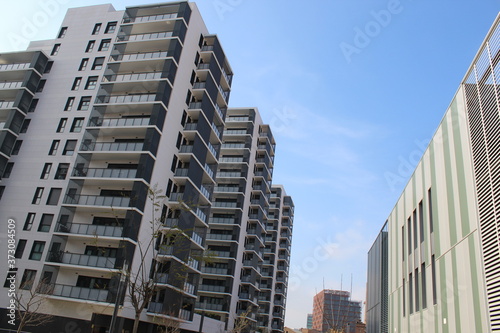 Edificios en semi contrapicado con cielo azul.
