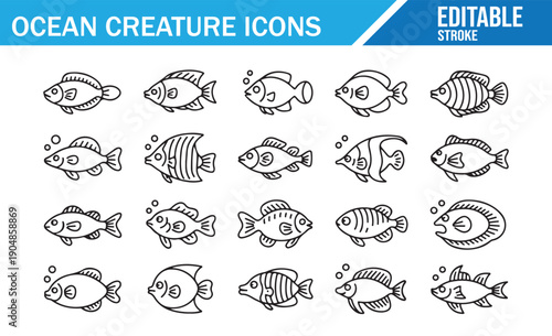 Editable Stroke Aquarium Fish Symbol Collection.