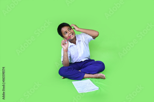 Education Concept,schoolboy do not understand the lesson or have no ida how to do homework at home with New normal for learning online , Social distancing concept