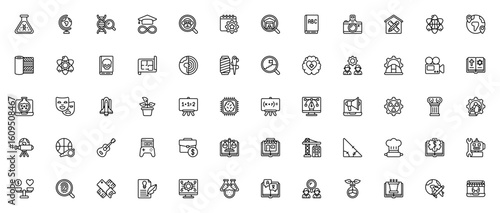 Education icon set. Minimal vector symbols for science, technology, arts & business. Includes flask, globe, DNA, book, laptop, rocket, AI and more. Editable line icons.