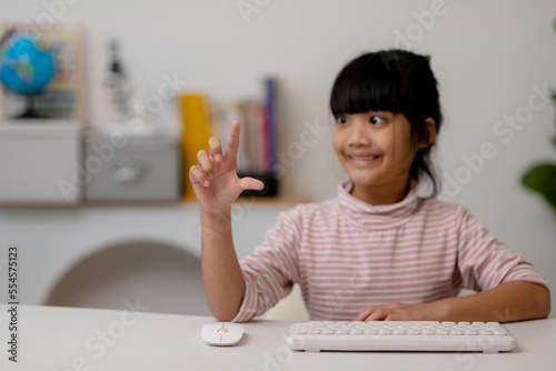 education, school, and imaginary screen concept - Asian little girl pointing in the air or imaginary screen