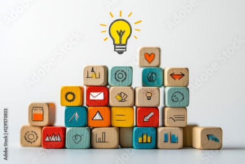 Educational concept with wooden blocks featuring letters and a glowing lightbulb