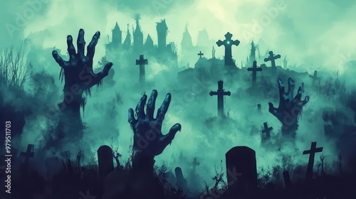 eerie ghostly hands reaching out from misty graveyard spooky halloween horror concept illustration