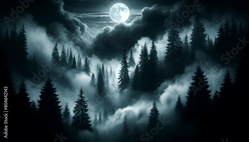 eerie gloomy pine forest shrouded in thick night fog, full moon visible through a gap in heavy clouds