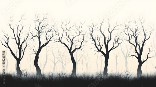 Eerie Spooky Tree Silhouettes Amidst Misty Forest Backdrop. A Minimalist Nature Artwork