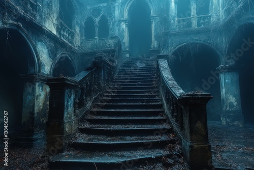 Eerie staircase in a decaying gothic building.