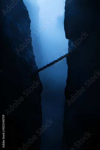 Eerie suspension bridge links rugged cliffs above a murky chasm enveloped in mist, evoking a sense of intrigue and peril for daring explorers
