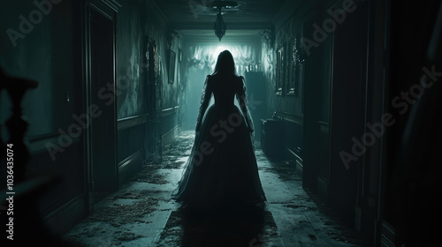 Eerie Victorian ghost with old-fashioned gown, standing in the dimly lit hallways of a grand Victorian estate with cracked marble floors and eerie shadows.
