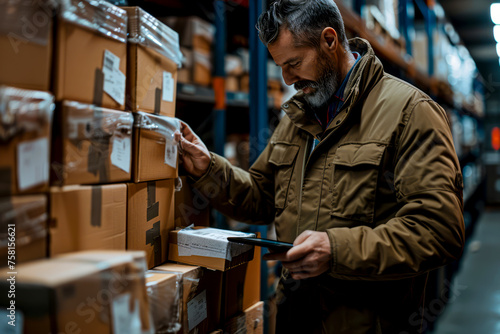 Efficient Middle-Aged Manager Utilizing Tablet for Barcode Scanning and Parcel Preparation in Warehouse Setting