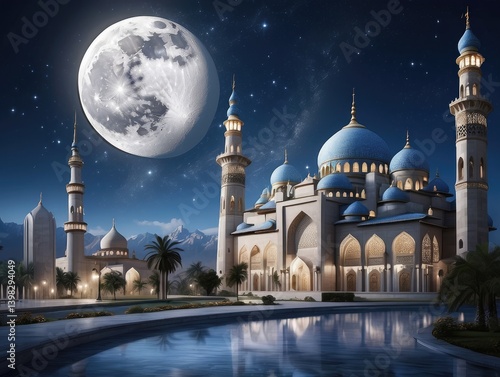 Eid al-Fitr celebration greeting with mosque skyline, crescent moon, and stars over an Arabian city at night. Ramadan Kareem, the end of fasting.