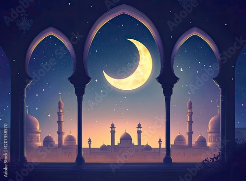 Eid Mubarak and Ramadan Kareem greetings with an Islamic arch window view of a mosque spire and the moon for banner design, with copy space on the right side. Elegant style stock photo,