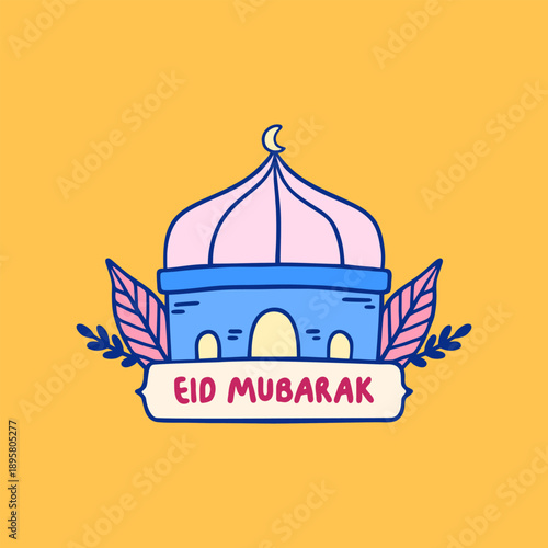 Eid Mubarak Hand Lettering with Mosque and Floral Decoration