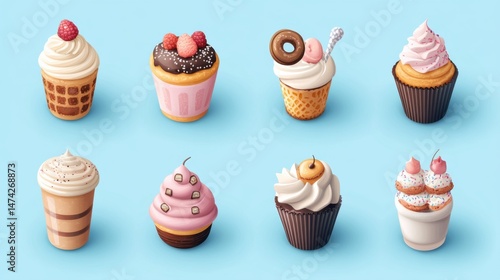 Eight Pixel Art Cupcakes and Coffee Drink on Light Blue Background