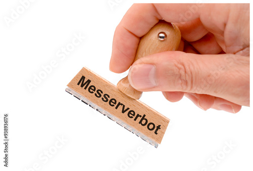 Ein Holzstempel ist beschriftet mit dem Aufdruck: Messerverbot