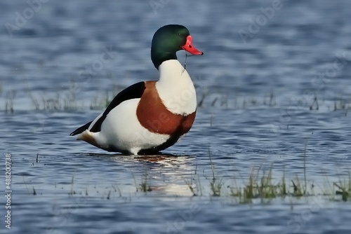 Eine Brandgans (Tadorna tadorna) steht im Wasser.