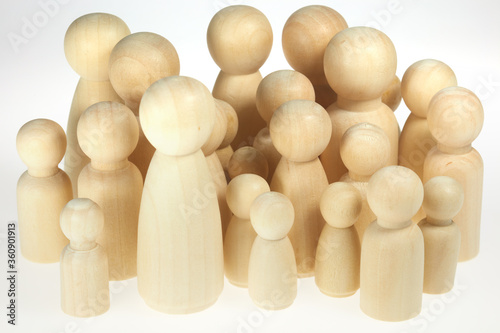 Eine Gruppe von Holzpuppen vor weißem Hintergrund.
