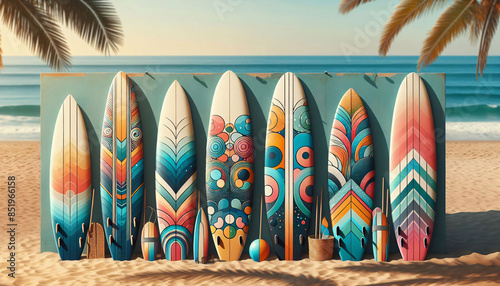 Eine Reihe bunt bemalter Surfbretter an ein Strand