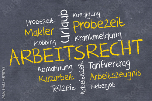 Eine Tafel zum Thema Arbeitsrecht mit vielen Schlagworten des Rechtsgebiets wie Prozeit, Kündigung, Tarifvertrag, Abmahnung und Kündigung