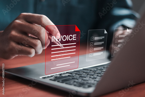 E-invoice and online digital statements concept, Businessman use computer laptop with invoice document on virtual screen.