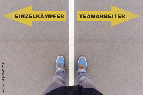 Einzelkämpfer oder Teamarbeiter, Pfeile mit Gegenteil Optionen als Wahl auf Strasse, persönliche Perspektive
