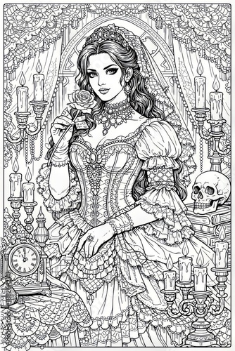 Elaborate black and white drawing of a Victorian woman holding a rose in a candlelit room with clocks and skull, ideal for gothic romance, fantasy stories, or coloring books.