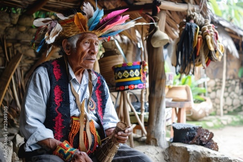 Elderly artisan creating traditional crafts in a vibrant village setting featuring handmade items and cultural artifacts