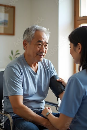 Elderly Asian Man Checking Blood Pressure — Health Care and Wellness