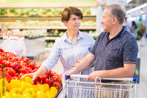 Elderly couple buys bell pepper in the alcoholic vegetables of a supermarket