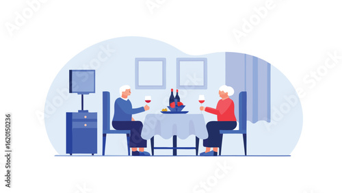 Elderly couple enjoying a romantic dinner with wine and fruit at a table in their dining room together