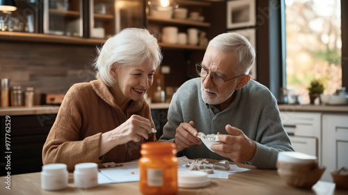Elderly couple sitting at a kitchen table, organizing and discussing medication. They seem engaged and are both smiling. The background shows a modern, cozy kitchen.