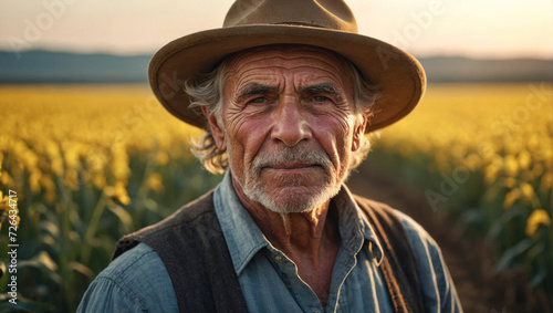 Elderly farmer face portrait, blurred yellow agriculture field background