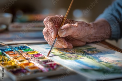 Elderly Hand Painting with Watercolor, Artistic Process.