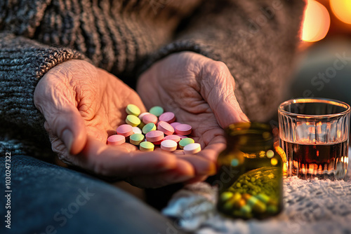 Elderly Hands Holding Colorful Pills Next to Glass and Medicine Bottle