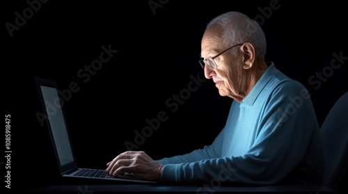 Elderly Man Deep in Thought as He Works on Laptop in Dark Room