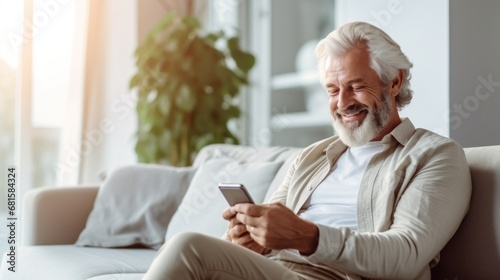 Elderly man relaxes on the sofa, scrolling his smartphone at home.