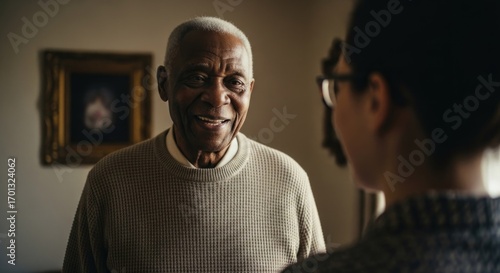 Elderly man talking to younger woman indoors, blurred painting visible behind