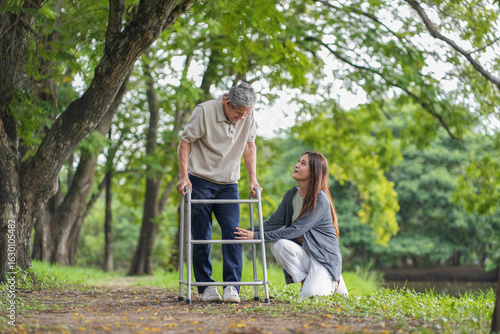 elderly man with walker aid resting in the nature park,standing and talking with a daughter who sitting on grasses touching and checking pain on father's leg,senior patient,recovery,rehab,exercise