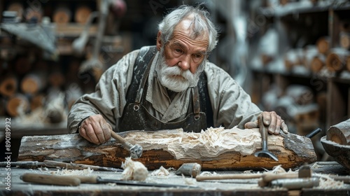 Elderly Man Working in Woodshop, Creating Artisan Products